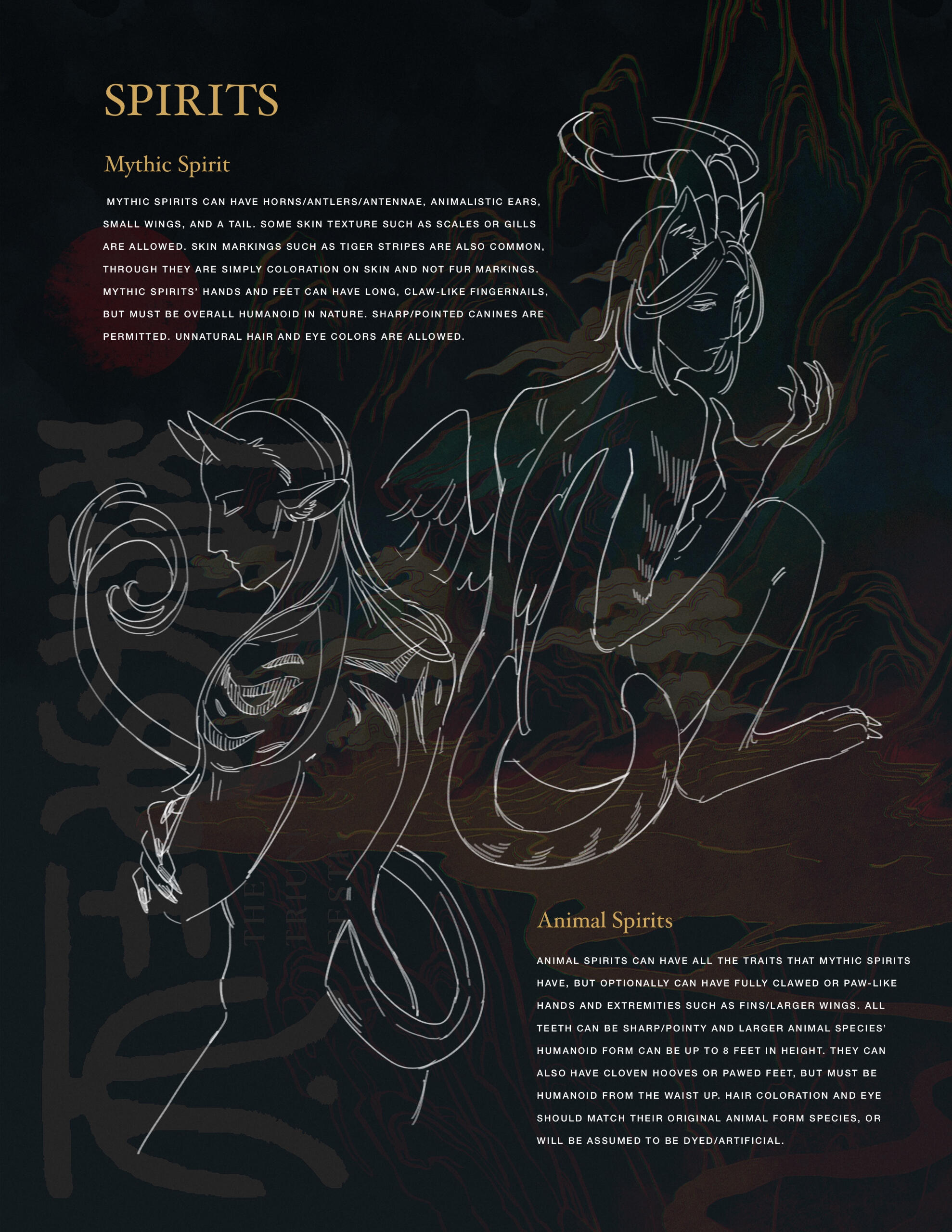 - Mythic spirits tend to have appearances that more closely resemble humans, as they were molded from the imaginations of man. Though their bestial transformations may appear less impressive or obvious than that of animal spirits, mythics are best known for their ability to call upon otherworldly powers granted through superstition.- Unlike animal spirits, these spirits are not ‘born’ from mortal bodies but come into being alone – any familial bonds are formed through choice, not blood.- All mythic spirits are considered to be deputies under the direct supervision of the Mountain King, forming a loose court across the spirit realm that acts as an intermediary between spirits and humans.- Lower acceptance %. Mythic spirits are much rarer in number than animal spirits and are subject to increased scrutiny – no repeats of the same species will be accepted!