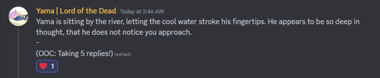 - Poster uploads RP starter as normal text. OP can limit how many people can reply - a maximum of 10 can be set for all rapid fire rps.- To interact with an open RP, first react to the OP with an emote. This will act as a “counter” to keep track of how many people will be replying.